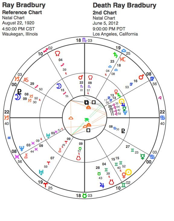 (Astrology Explored) As the transiting moon joined with transiting Pluto, challenging his Arabic Part of Death at 15 degrees Libra, and as Venus made a rare transit across the face of the Sun, Ray Bradbury slipped away from the bounds … Continue reading