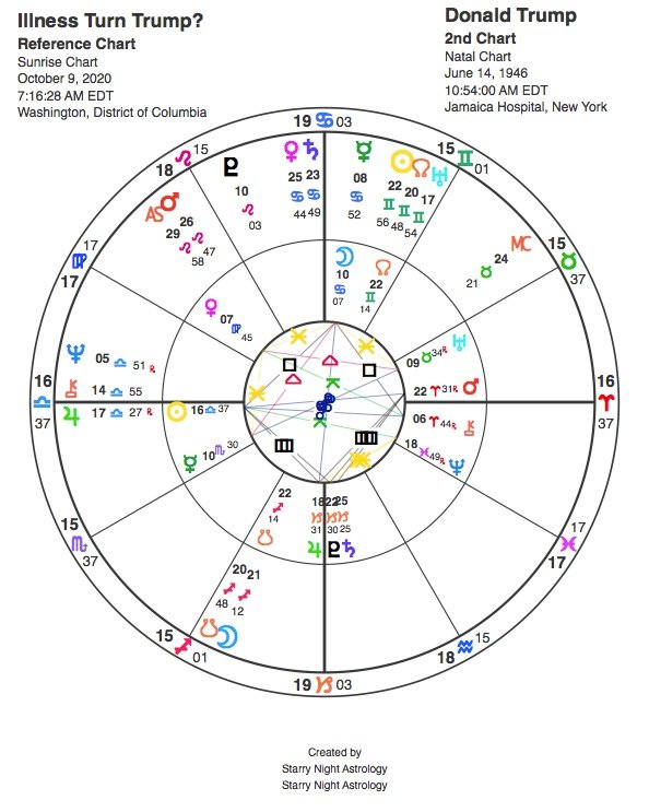 Now take a look at the aspects to the event Sun which traced in the black lines. That’s a T-Square, and the focal point of that T-Square is the event Jupiter, Pluto, and Saturn. Trump is much sicker than his doctor is saying, And in my opinion, he’s about to get much sicker.
